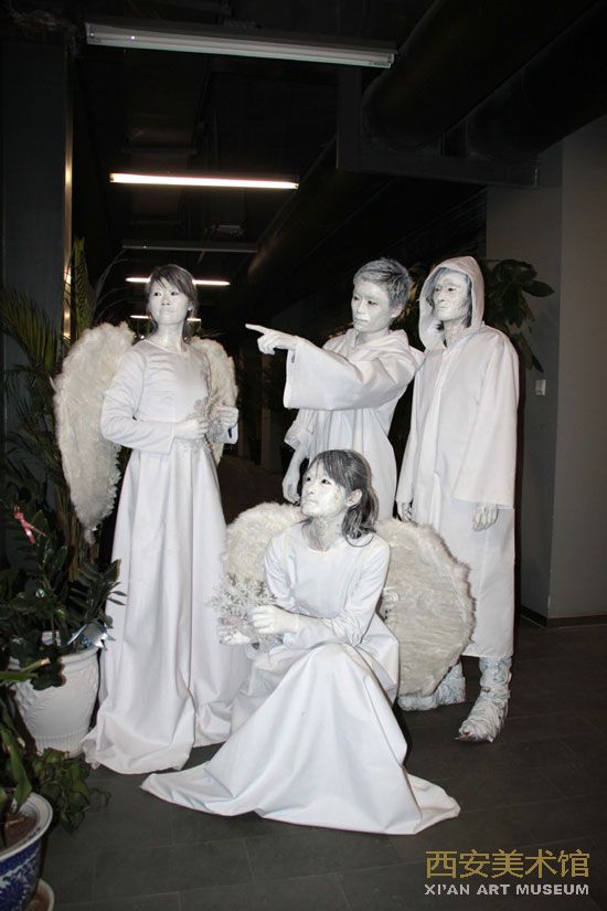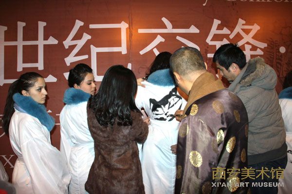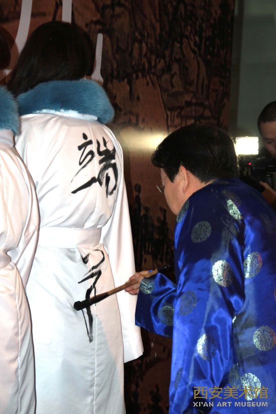 活动现场20名佳丽身着汉服,由著名书法家在汉服上泼墨作画,寓意东西方文化的完美融合。同时在西安美术馆的大门口,活体雕塑的呈现吸引了不少人的目光!