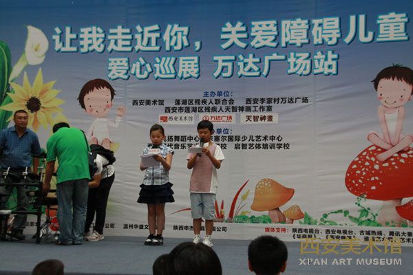 6月1日,由西安美术馆主办,西安市莲湖区残疾人天智神画工作室、西安李家村万达广场、西安卡塞尔国际少儿艺术有限公司共同协助举办了此次“让我走近你,关爱智障儿童”爱心义卖活动,这次义卖活动旨在号召全社会加强对智障儿童这一群体的关注和了解,给智障儿童送去更多关爱和鼓励,帮助他们健康快乐地成长。