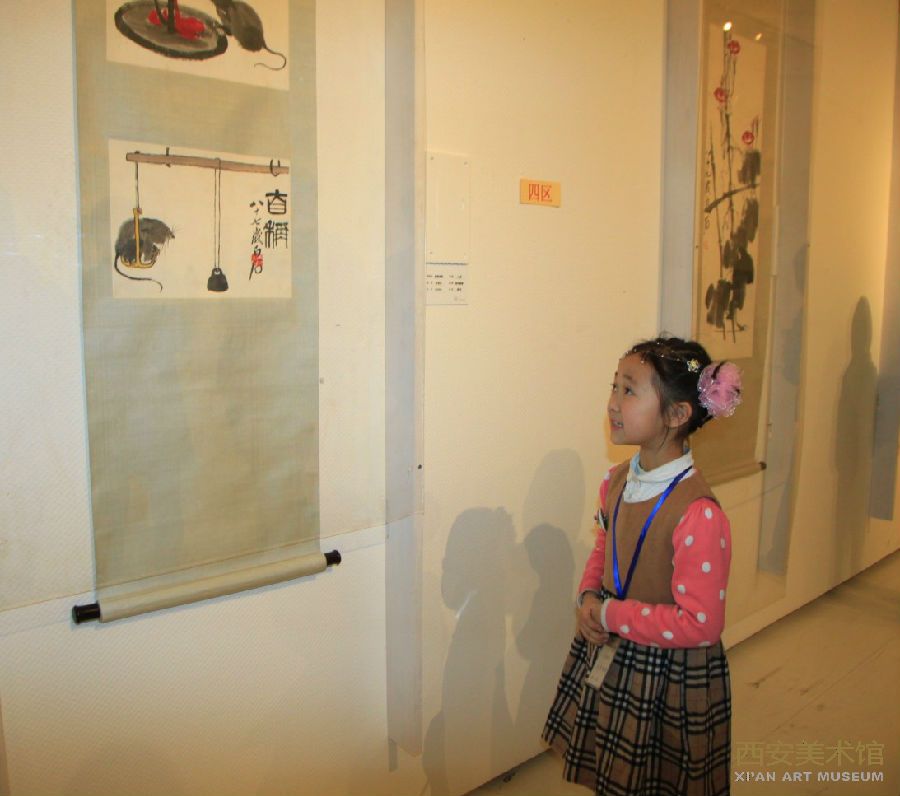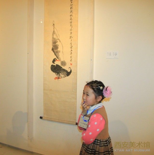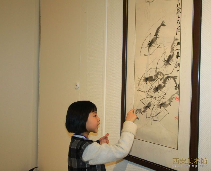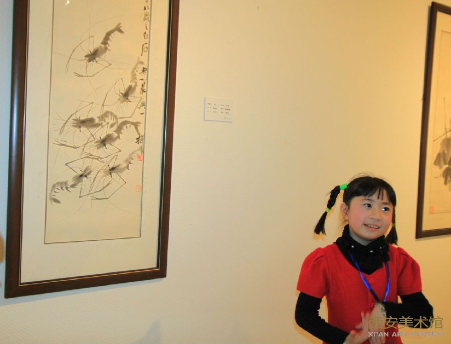 钟依君小朋友则说:“齐爷爷小时候常常在河边玩耍,画虾也是他对童年的回忆。”并且她还颇有想象力地说:“我觉得这最上面的一只虾就是白石爷爷他自己,你们看,他正在游来,好奇地观看大家。”她们绘声绘色的讲解,引来游客赞叹的目光。