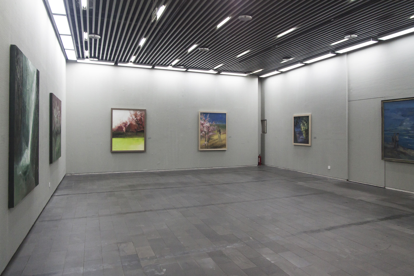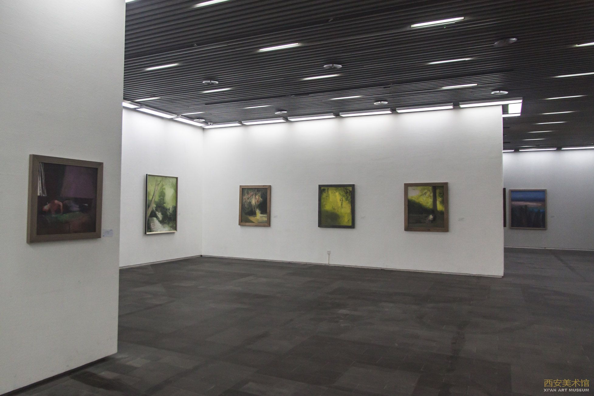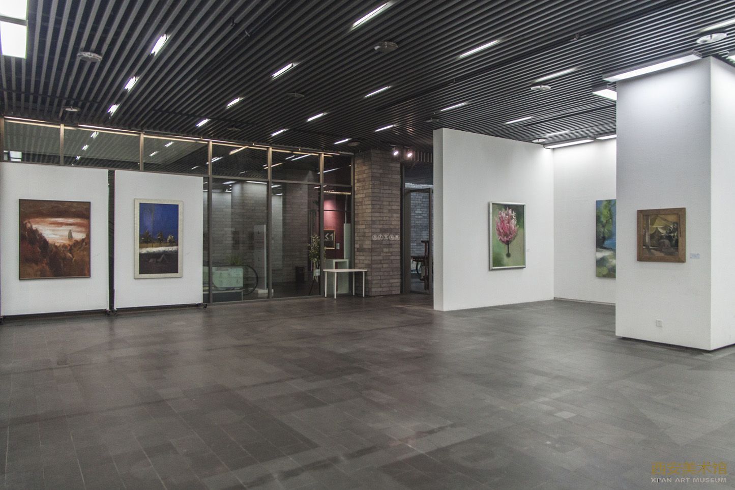 二号展厅位于西安美术馆1楼电梯南侧,电梯边的玻璃幕墙给作品更充分的展示机会,展厅的地板与天花板均进行了暗色处理,只为更突出墙面上的作品,二号展厅共220平方米,展线68 米。